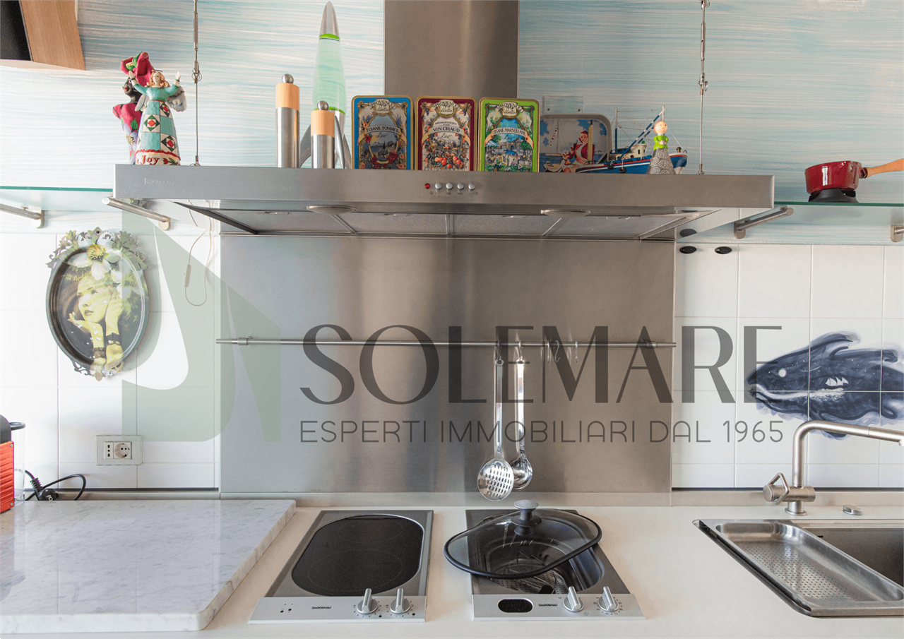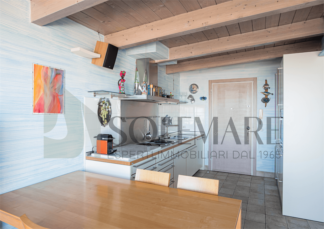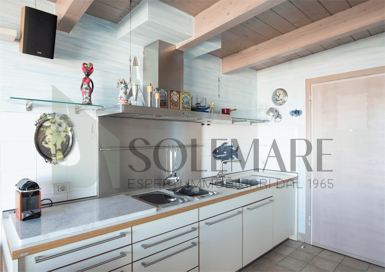 Formato da sala da pranzo con angolo cottura, 1 camera matrimoniale + rete apribile, 1 bagno con box doccia. Balcone in attico di mq 50 attrezzato con splendida vista mare.